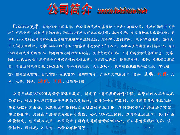 Feizhuo斐卓,以致力于為噴霧技術傳遞進步動力為己任!堅持自主研發(fā)創(chuàng)新,采用行業(yè)高端設備和儀器,不斷提升產(chǎn)品的性能,讓斐卓制造的產(chǎn)品能夠完全達到行業(yè)高標準的要求,實現(xiàn)國際化的市場供應!噴嘴產(chǎn)品及噴嘴的應用咨詢熱線:139 1663 9930!