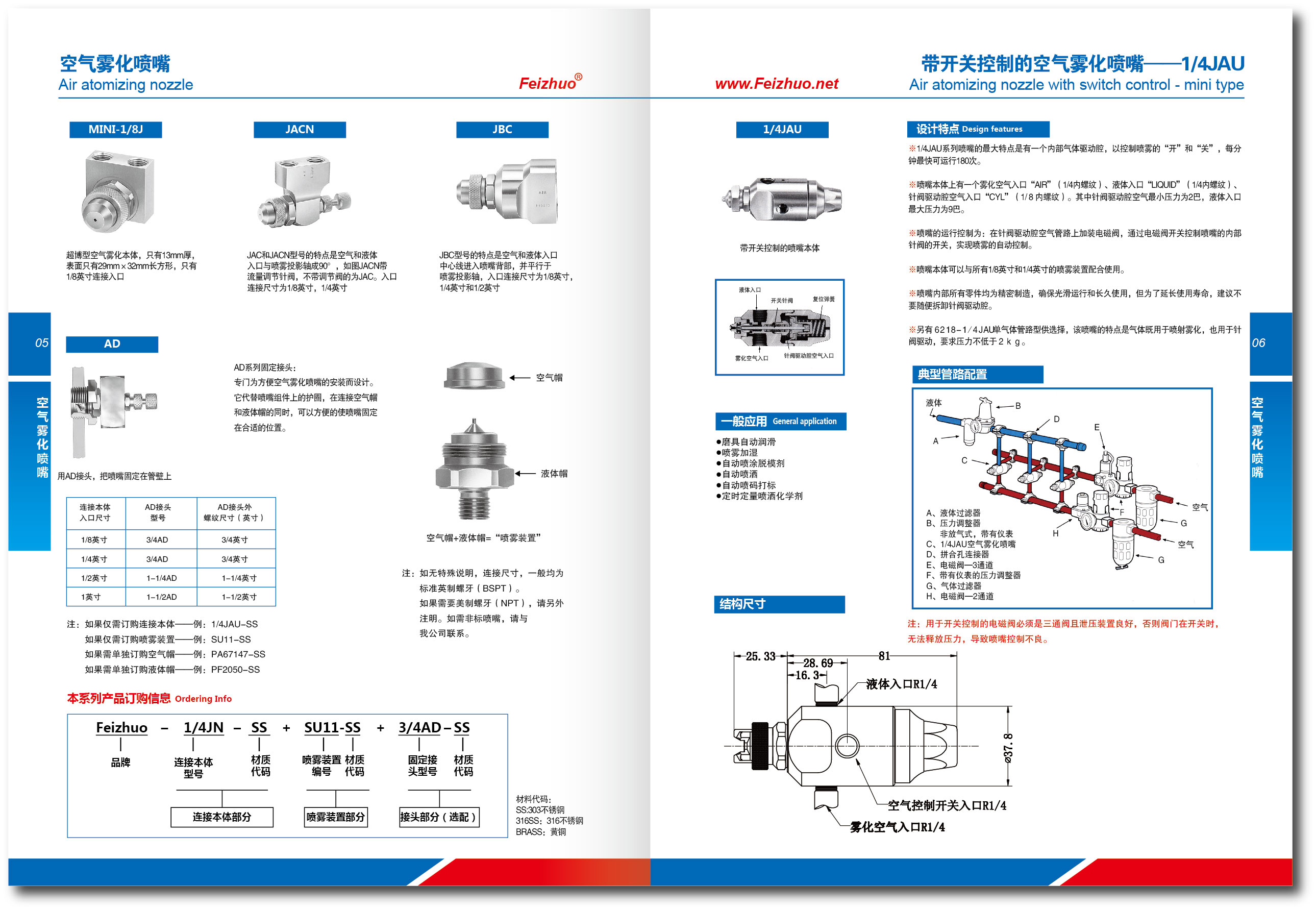 空氣和液體入口中心線進(jìn)入噴嘴背部,并平行于噴霧投影軸,入口連接尺寸為1/8英寸,1/4英寸,1/2英寸!