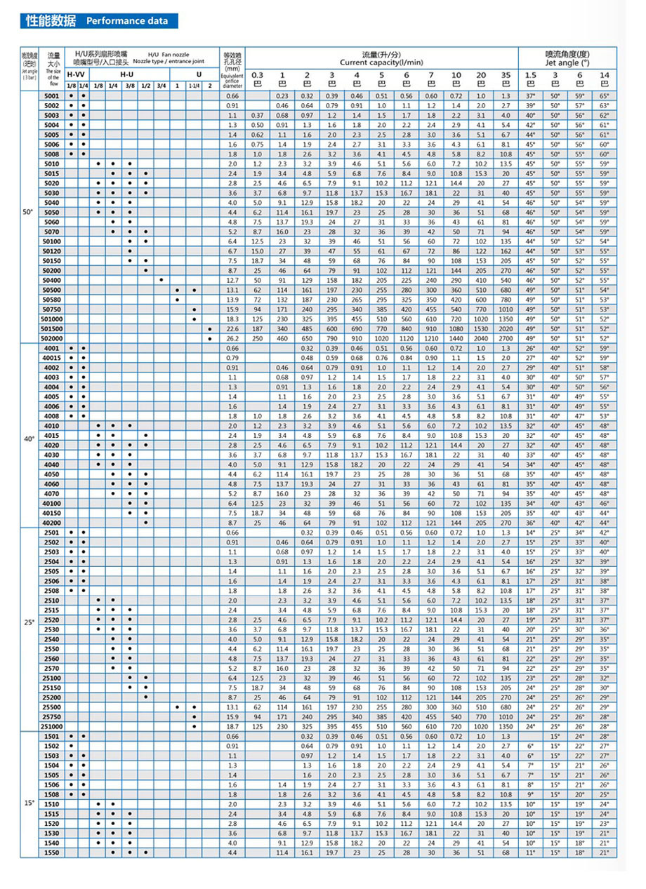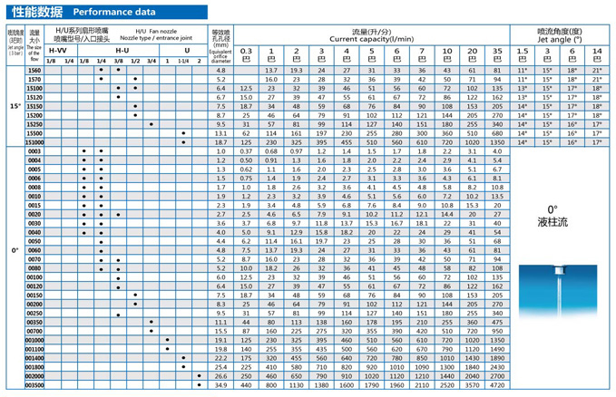 TP type fan spray nozzle can provide high impact liquid column flow or fan-shaped spray.Jet Angle between 0 ° to 110 °.