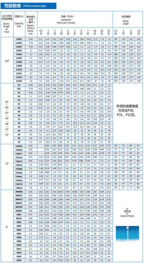 Application consulting: 139 1663 9930 Design characteristics of combined fan nozzle TP fan spray nozzle can provide high impact liquid column flow or fan spray. The spray angle is between 0 and 110. The spray produced by the spray head is e